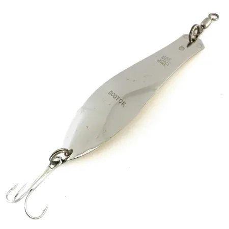 Detta 9,5 cm långa skeddrag, stämplat i metallen med varumärket "DOCTOR" och ursprunget "USA", uppvisar en högkontrastfinish i två toner. Ena sidan har en reflekterande nickelplätering, medan baksidan är färdigställd i polerat guld, vilket ger olika ljusreflexer beroende på ljusvinkeln. Med en vikt på 17 g gör den solida metallkroppen det till ett rejält val för både spinnfiske och trolling. Detaljerna består av ett lekande i fören för att hantera linvridning och en stark trekrok fäst via en fjäderring baktill. Vad gäller skicket är det i utmärkt 5/5-status, där ytorna behåller sin ursprungliga lyster och stämplingarna förblir skarpa och läsbara. Denna specifika modell, identifierad med produktkod 8515, representerar en klassisk design som använts av generationer av sportfiskare för att rikta in sig på större sötvattensrovfiskar.