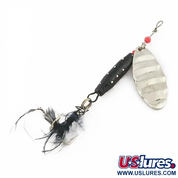 Med en vikt på 7 g (1/4 oz) har denna japansktillverkade spinnare en distinkt avsmalnande svart kropp prydd med vit marmorering. Skeden i nickelfinish har en räfflad textur designad för att reflektera ljus längs sin 7 cm (2 3/4") längd. Dolphin Marble-spinnaren, med produktkod 24421, uppvisar typisk japansk tillverkning från mitten av seklet, vilket syns i den enkla trådlindade konstruktionen och de röda pärlaccenterna nära linfästet. Trekroken är försedd med mörka fjädrar, vilket ger en mjuk visuell profil bakom den viktade marmormönstrade kroppen. Just detta exemplar visar sin ålder genom en händelserik historia på sjön och har ett skick på 1/5 med tydligt slitage från tidigare fisketurer. En liten bygel i metall gör att den ovala skeden sitter en bit ifrån den svartvita kroppen, vilket bibehåller den klassiska profilen för en inline-spinnare.