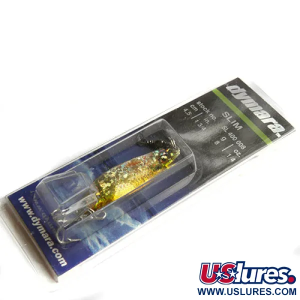 Med en vikt på 8g (1/4oz) har detta Dymara skeddrag en levande regnbågsdekor som fångar ljuset mot dess texturerade yta. Detta specifika exemplar, tillverkat i Kanada av Dymara Industries och katalogiserat under produktkod 0838, mäter kompakta 4,5cm (1 3/4"). Förpackningen identifierar detta som "Slim"-modellen, specifikt lagernummer SL 400 008. Draget ligger kvar i sin originalblister och håller skicket 6, vilket indikerar att det är oanvänt och bevarat exakt som det lämnade anläggningen i Campbell River, B.C. Designat för mångsidighet, noterar baksidan av kortet dess lämplighet för spinnfiske, trolling och pimpelfiske, med en varning om att draget inte får böjas. Hårdvaran inkluderar en vass trekrok och en robust fjäderring, typiskt för den pålitliga konstruktion som förväntades av denna numera nedlagda tillverkare. Regnbågsmönstret är noggrant applicerat med en blandning av glittrande guld- och silversjäll, accentuerat av en subtil rosa sidolinje och mörka fläckar.
