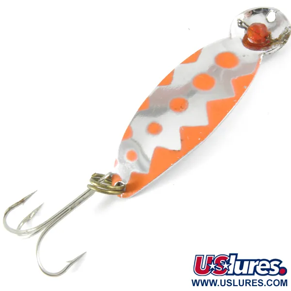 Med en vikt på stadiga 1/2oz (14g) bär detta klassiska skeddrag den tydliga 'One eye'-designen som är karakteristisk för Errico-serien. Den 3" (7,5 cm) långa förnicklade kroppen har ett dristigt orange mönster med prickar och en central sick-sack-rand, även om färgkombinationen betecknas som Nickel / Röd i katalogen. En ensam röd glaspärla är säkert infattad i dragets huvud, vilket ger en tredimensionell fokuspunkt som har gett modellen dess namn. Dragets polerade baksida är stämplad med ett lönnlöv, en detalj som ofta återfinns på högkvalitativa kanadensiska fiskeredskap från denna era. Monterat med en trekrok via en fjäderring, finns detta bete i katalogen under produktkod 3683. Med ett skickbetyg på 4/5 visar draget mycket lätta ålderstecken; förnicklingen har kvar sin reflekterande lyster och de målade detaljerna är välbevarade.
