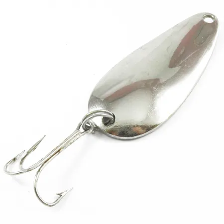 Tydligt stämplat på den konkava sidan av metallen finns namnet "EVANS", vilket identifierar detta 2 1/2" (6,5 cm) skeddrag som ett klassiskt stycke amerikansk sportfiskehistoria från Glen Evans. Betet väger 3/4 oz (21 g) och är ytbehandlat i en blank Rainbow Nickel som erbjuder betydande reflektionsförmåga för olika vattensikter. Detta exemplar, med produktkod 3247, är bevarat i ett 4/5-skick och visar en välskött yta som framhäver dess droppformade geometri. Hårdvaran inkluderar en stor trekrok fäst via en stark fjäderring, avsedd för påfrestningarna vid tungt kastfiske och invevning. Ett precisionsborrat hål i huvudet ger en säker fästpunkt för ett beteslås eller tafs. Den stämplade märkningen inuti skeden är fortfarande skarp och läsbar, vilket återspeglar den industriella standarden för tillverkningen i USA.