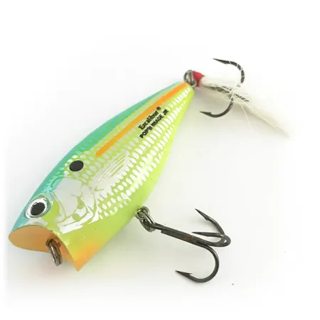 Gula och gröna nyanser smälter samman med en holografisk finish på detta 6 cm (2 1/4") ytbete, vilket skapar ett realistiskt skimmer som fångar ljuset även i grumligt vatten. Identifierad med produktkod 6620, är detta exemplar "Jr"-versionen av Excalibur Pop'n Image-serien. De silvriga gällock-detaljerna och den stora svarta fläcken bakom ögat fungerar som visuella triggers för abborre och gädda. På baksidan ger en vit fjäderförsedd trekrok en tydlig huggpunkt och subtil rörelse under spinnstopp. Detta specifika bete är i utmärkt skick, betygsatt 5/5. Vikten på 9g (1/3oz) möjliggör kontrollerade kast över ytan (0m/0ft), där de texturerade fjällen efterliknar blixten från en panikslagen betesfisk. Den främre hårdvaran sitter säkert i den konkava munnen och de ursprungliga fjäderringarna visar inga tecken på utmattning.