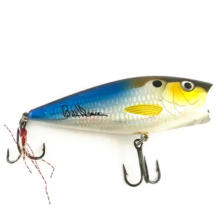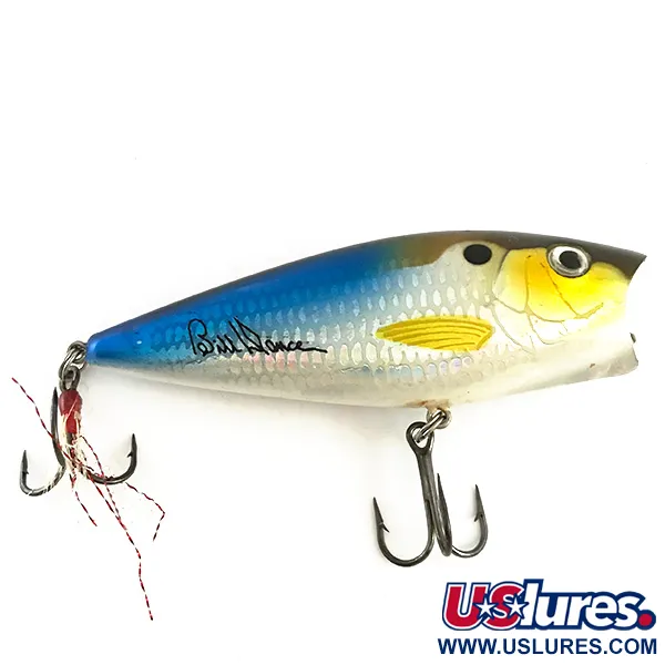 Den legendariske sportfiskaren Bill Dances signatur pryder den blåtonade sidan på detta ytgående bete. Med en längd på 8 cm (3 1/4") använder betet en skålad mun för att flytta vatten direkt på ytan (0 m). Vikten på 12,5 g (2/5 oz) ger stabilitet för långa kast mot strukturer. I färgvalet Threadfin Shad reflekterar en holografisk finish ljuset genom de silverfärgade, fjällmönstrade sidorna, medan en gul strupe ger en subtil kontrast. På den vita buken syns produktkod 6482 tillsammans med den tydligt tryckta logotypen "Excalibur POP'N IMAGE". Den bakre trekroken är försedd med röda och vita fjädrar ämnade att locka till hugg när betet ligger stilla. Detta exemplar är i mycket gott skick med betyget 5/5.