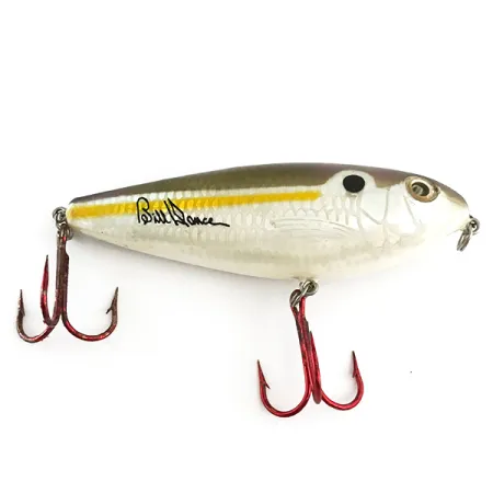 Röda trekrokar kontrasterar mot det silvriga fjällmönstret på denna Heddon Excalibur Spit'n Image, som bär Bill Dances signatur på sidan. Detta ytgående bete, en imitation av en shad med produktkod 6619, väger 10g (1/3oz) och är 7,5cm (3") långt. Finishen i Lila / Guld kännetecknas av en mjuk violett nyans över huvudet och en klargul sidolinje på flankerna. Detta USA-tillverkade bete är konstruerat för att skapa ljud och är designat för fiske i det övre vattenlagret på djup upp till 0,5 m (1,6ft). Det fysiska skicket är exemplariskt med en välbevarad finish och vassa krokar, vilket ger det betyget 5/5. Ett detaljerat öga med svart pupill och guldring bidrar till det verklighetstrogna utseendet, kompletterat med en fabriksmonterad fjäderring i nosöglan.