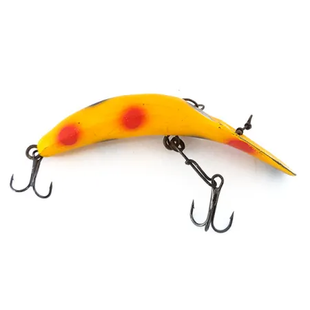 Gul basfärg fungerar som en högvisuell bakgrund för de tydliga röda och svarta prickarna på denna Yakima Bait FlatFish X5. Med en längd på 6 cm (2 1/4") och en vikt på 7 g (1/4 oz) är denna klassiska bananformade wobbler en ikonisk del av amerikansk sportfiskehistoria. Mönstret på artikelnummer 10995 har tydliga röda cirkulära prickar på sidorna och mörkare svarta prickar på ryggpartiet. Den har den traditionella FlatFish-krokupisättningen med två vassa trekrokar anslutna via skruvöglor och trådspridare. Designad för att nå djup på 4 m (13 ft), används denna modell traditionellt för slowtrolling eller jämn hemvevning vid fiske efter öring, abborre eller gädda. Skicket på detta specifika exemplar är graderat till 4/5 och uppvisar en välskött finish med mindre spår av fiskehistorik. Stansade detaljer och den handmålade finishen speglar mitten av århundradets tillverkningsstandarder från dess ursprung i USA.
