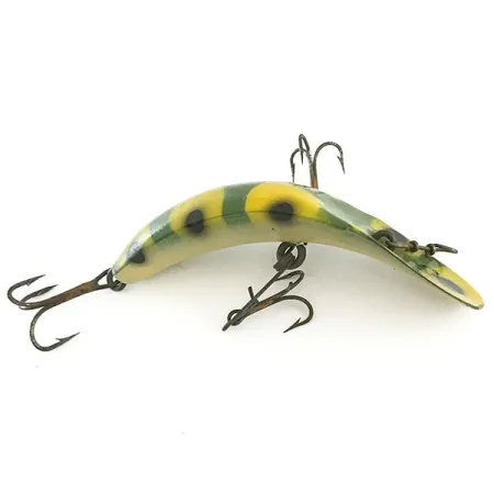 Ett iögonfallande Groda-mönster pryder den böjda kroppen på detta vintageexemplar, med tydliga gula segment och mörka, cirkulära fläckar mot en mörkgrön bakgrund. Betet är utrustat med en distinkt uppsättning hårdvara, inklusive två bukmonterade trekrokar och en tredje trekrok vid stjärten, alla säkrade med karaktäristiska trådlindade fästen. Med en längd på 7 cm (2 3/4") och en vikt på 5 g (3/16 oz) är denna storlek X5 ett klassiskt exempel på Charles Helins ikoniska design. Tillverkad av Helin Tackle och identifierad med produktkod 6662, speglar hantverket kvaliteten hos den Detroit-baserade tillverkaren. Den glansiga finishen förblir livfull över hela ytan, vilket ger detta exemplar ett skickbetyg på 5/5. Designad för spinnfiske eller långsam trolling, är den förskjutna linhållaren på det platta, breda huvudet ett kännetecken för FlatFish-familjens unika geometri.