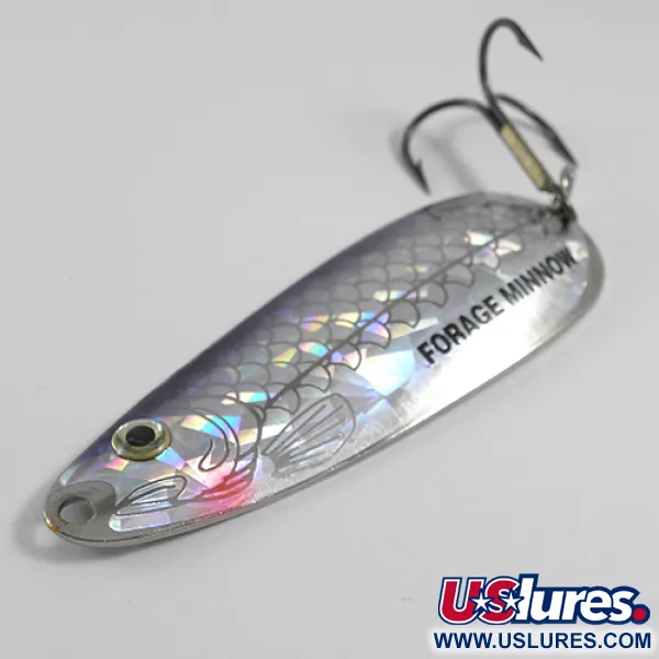 Ett distinkt fjällmönster av regnbågslax täcker den reflekterande ytan på detta 9 cm långa skeddrag i metall. Northland Forage Minnow väger 21 g och är konstruerad för att ge en kraftig profil vid både spinnfiske och vertikalfiske. Detta exemplar, med produktkod 1607, visar tillverkarens amerikanska arv med ett stämplat namn som är tydligt synligt över den holografiska texturen. Utrustningen består av en robust trekrok monterad med en pålitlig fjäderring, båda i nyskick. Ett litet tryckt öga nära betets topp ger en realistisk fokalpunkt, medan baksidan har en polerad, konkav silverfinish som skapar ljusreflexer genom hela vattenpelaren. Den solida konstruktionen är framtagen för rovfiskar som jagar betesfisk med hög kroppsform.