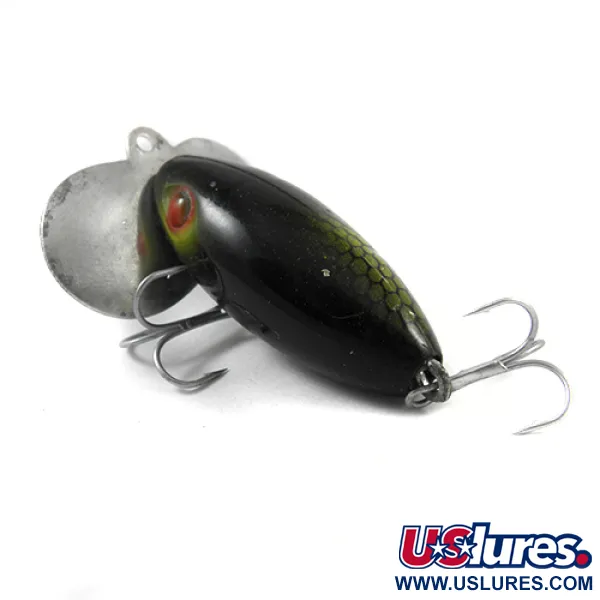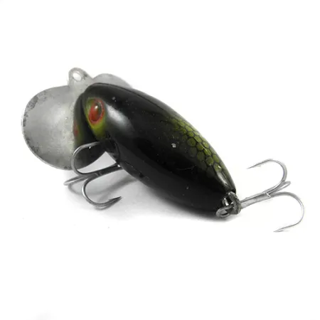 Med en längd på exakt 2 tum (5 cm) är frontplattan i metall på detta Atlantic Lures-exemplar tydligt stämplad med modellnamnet och ursprunget från Providence, R.I. Betet på 3/16 oz (6 g) har en svart kropp prydd med ett chartreusefärgat bikakemönster på sidorna och tydliga ögon med rött centrum. Frantic Antic, identifierad med produktkod 2750, är en ytgående plugg designad med ett stort silverblad som skapar hörbara ploppande ljud när den rör sig över ytan. Monteringen består av två originaltrekrokar, en placerad på buken och en monterad i den bakre skruvaulan. Betet har skicket 4/5 och uppvisar lätt slitage på de silverfärgade metallkomponenterna medan den målade finishen förblir livfull över hela profilen.