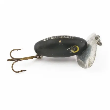 Direkt präglat i metallskeden finns namnet JITTERBUG tillsammans med ursprunget Fred Arbogast Akron, Ohio, vilket identifierar detta som ett genuint stycke amerikansk sportfiskeutrustning. Med en djupsvart finish ger denna 1 1/2" (4 cm) ytgående wobbler den högkontrasterande silhuett som erfarna sportfiskare förlitar sig på vid sämre ljusförhållanden. Betet väger 1/8 oz (4 g), vilket gör det till ett specifikt val för lätt fiske efter abborre och bass i lugna vatten. Den karaktäristiska breda, skålade skeden hålls på plats av två originalskruvar och fungerar som den främsta källan till störningar på vattenytan. Vita blockbokstäver på ovansidan av kroppen är fortfarande läsbara, och de målade gula ögonen visar endast minimala tecken på slitage. Bedömd till 4/5, det övergripande utseendet är mycket rent med endast lätta ytmärken synliga vid närmare granskning. En enkel trekrok är fäst i buköglan, vilket matchar den kompakta profilen för denna modell, katalogiserad under produktkod 24507.