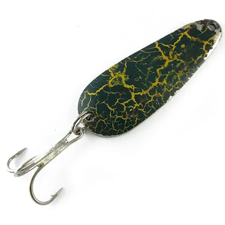 Ett distinkt grodmönster i krackelerad finish med gula inslag över en djupgrön bas pryder framsidan av detta skeddrag på 9 g (1/3 oz). Den 5,5 cm (2 1/4") långa metallkroppen har en polerad förnicklad baksida där namnet "GADABOUT GADDIS" är tydligt instämplat i metallen. Detta bete, med produktkod 6246, är en klassisk representant för amerikansk fiskeutrustning från mitten av seklet, förknippad med den legendariske "Flying Fisherman". Betet är riggat med en silverfärgad fjäderring och en robust trekrok. I sitt nuvarande 4/5-skick uppvisar betet lätta ytmärken på den målade finishen, medan nicklet förblir blankt och stämplingen är mycket tydlig. Detta exemplar är designat för spinnfiske i sötvatten, där kontrasten mellan den mörka ovansidan och den reflekterande undersidan är som mest effektiv.