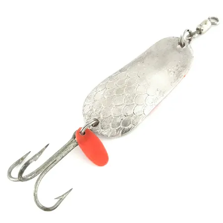 Detta 25g (1oz) skeddrag är tillverkat i Kanada och har ett distinkt hamrat fjällmönster på sin silverfinish. Gibbs Delta Kit-A-Mat #55 mäter 6 cm (2 1/4") och har produktkod 7086. Den kombinerar sin metalliska glans med en kraftig, fluorescerande orange baksida som lyser starkt under UV-ljus. Denna färgkonfiguration är särskilt utformad för synlighet i djupare eller grumligt vatten. Komponenterna är robusta med en kraftig trekrok som pryds av en liten röd lockfena i plast vid fjäderringen. Draget levereras färdigriggat med ett lekande för att förhindra linvridning vid kast eller trolling. Tillverkarens stämpel är tydligt synlig på den fluorescerande sidan. Detta exemplar är i skick 4/5, med välbevarade ytor och rena komponenter. Dess tunga profil i förhållande till längden möjliggör långa kast även under blåsiga förhållanden.