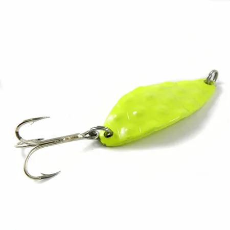 Detta 1/2 oz (14 g) skeddrag i en lysande Chartreuse-finish sticker ut bland amerikansktillverkade metallbeten. Med en längd på 2" (5 cm) har Gibbs KOHO en karakteristisk hamrad yta på kroppen, designad för att maximera ytarean och reflektionen. På baksidan är varumärkesstämpeln "GIBBS KO-HO" tydligt präglad i metallen, vilket bekräftar dess autentiska ursprung från USA. Detta exemplar, med produktkod 2813, är i ett fint 4/5-skick där den ljusa färgen visar minimalt slitage. Varustukseen kuuluu en robust trekrok monterad med fjäderring, vilket gör det till ett pålitligt val för långdistanskastning eller trolling. Droppformen och viktfördelningen är framtagna för stabilitet och distans vid fiske efter lax eller öring.