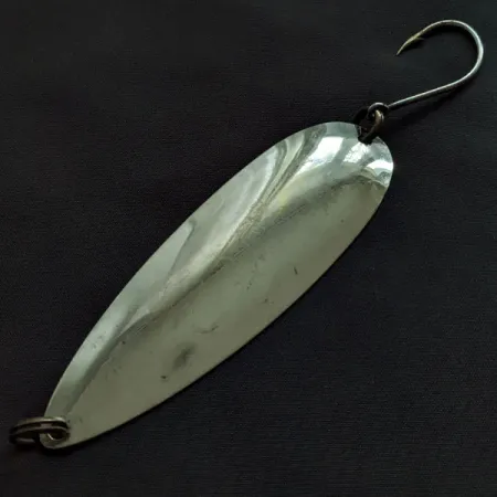 Med en tydlig 'GIBBS SICAMOUS 4'-gravyr på den konkava sidan av metallen identifieras detta klassiska skeddrag för trolling från en etablerad tillverkare. Den högblanka nickelfinishen är reflekterande över hela dess 10 cm längd och fångar ljuset effektivt för en bra presentation under olika vattenförhållanden. Med en vikt på 17 g har detta exemplar, med produktkod 21433, den traditionella droppformade profil som kännetecknar Gibbs USA-tillverkade produktion. Utrustningen består av mörka fjäderringar i båda ändar, med en stor och vass enkelkrok monterad för trolling. Den slanka, avlånga kroppen är karaktäristisk för Sicamous-serien, som samlare uppskattar för dess enkla men effektiva metallarbete. Ytan visar minimala tecken på hantering och får betyget 5/5 för sin bevarade lyster. De mörka fjäderringarna skapar en kraftig kontrast mot skeddragets ljusa, spegelblanka nickelförgyllning.
