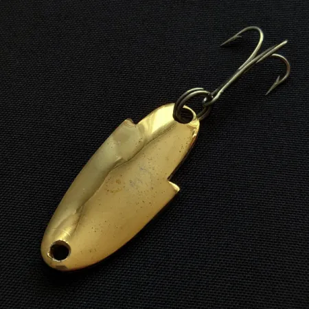 Detta skeddrag på 3/16 oz (5,7 g) från Glen Evans glänser i en djup guldfinish och är en klassisk del av amerikansk sportfiskehistoria. Metallkroppen har en tydlig insvängd profil vid mitten, ett designelement som är karakteristiskt för Evans "561"-modellen, vilken mäter 1 1/2 tum (3,5 cm) i längd. På baksidan av draget syns tillverkarens tydliga stämpel "EVANS '561'" präglad i den konkava ytan, vilket bekräftar dess äkthet och arv som en USA-tillverkad produkt. För montering används en kraftig fjäderring som håller en bronserad trekrok, medan ett precisionsskuret hål i nosen är redo för direkt lina eller beteslås. Detta exemplar har produktkod 20484 och är i ett anmärkningsvärt 5/5-skick, med välbevarade ytor som reflekterar ljus med hög klarhet. Det representerar ett sällsynt fynd för dem som uppskattar den enkla men effektiva geometrin hos metallbeten från mitten av seklet.