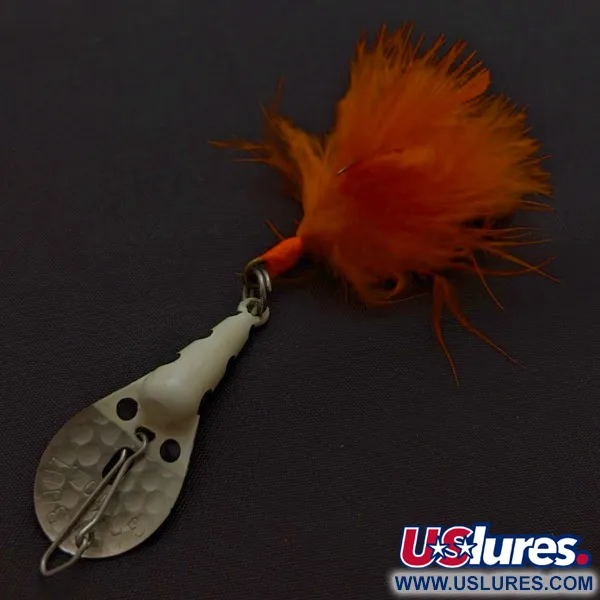 Svarta prickar på en vit emaljerad finish skapar en slående kontrast mot den stansade metallkroppen på detta 1/4 oz (7 g) drag. Glen Evans använde en karakteristisk tvådelad konstruktion för Gad-About, med en främre skeddel i metall stansad med märkes- och modellnamn. Baktill är en generös tofs av orange fjädrar bunden vid kroken med matchande orange tråd, vilket bibehåller dess fylliga profil. Draget mäter 2" (5 cm) i längd och hårdvaran är blank och fri från oxidering. Detta exemplar är i 5/5-skick, där färg och fjädrar ser ut precis som när de lämnade fabriken.