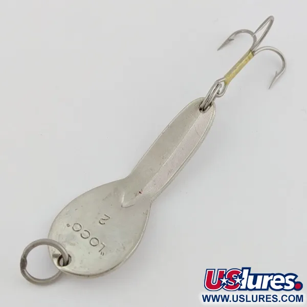 Med en tydlig stämpel "LOCO" 2 på baksidan, visar detta 1/4 oz (7 g) skeddrag upp den klassiska offset-geometrin som Glen Evans ursprungligen introducerade på marknaden. Den 2" (5 cm) nickelfinishade kroppen har en distinkt droppform som smalnar av mot en smalare hals, en profil balanserad för presentationer på grunt vatten i djup upp till 1 m. Ljusreflekterande holografiska schackrutiga inlägg är applicerade på både bladet och den övre sektionen, vilket ger ett flervinklat sken designat för att utlösa hugg i stillastående vatten eller längs gräskanter. Bevarat i 5/5-skick, visar exemplaret en blank nickelfinish och originalets gula slang över trekrokens skaft. Även om det senare tillverkades av Luhr Jensen, är denna Glen Evans-version ett rent exempel på den tidiga produktionsdesignen. Viktfördelningen gynnar en stabil gång vid kast mot strukturer eller under jämn trolling. Produktkod: 24528.