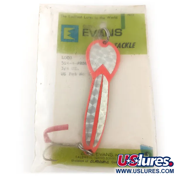 Med en vikt på 3/4oz (23g) är det karaktäristiska utseendet på detta skeddrag ett klassiskt val för fiske efter gädda i stillastående vatten på djup upp till 1 m (3.3ft). Denna Glen Evans Loco 4, med produktkod 12100, har ett Orange / Hologram-mönster som förblir extremt synligt tack vare sina UV-reaktiva egenskaper. Draget mäter 3 1/2" (9cm) och tillverkades i Caldwell, Idaho, under varumärkets tid hos Gladding Corporation. Det är ett oanvänt exemplar i originalförpackning med fabrikskort, och visar endast mindre tecken på lagringsslitage. Utrustningen består av en kraftig fjäderring för linan och en stor trekrok, där en spets är täckt av en röd skyddshylsa i vintagestil. Tekniska data tyder på att draget ger en mycket livlig presentation vid både spinnfiske och trolling. Den holografiska tejpen är exakt infälld i de orangea kanterna, ett signum för hantverket från denna era innan produktionen togs över av Luhr Jensen. En robust fjäderring i metall vid öglan säkerställer att draget håller för kraftiga hugg.