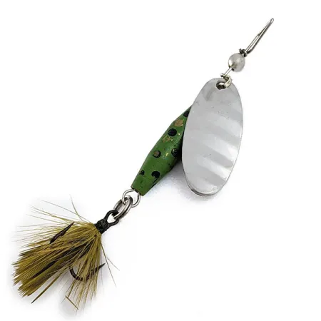 Nickelpläterade skedar definierar det klassiska utseendet hos denna Shyster, en design som ursprungligen skapades av Glen Evans innan produktionen senare togs över av märken som Luhr Jensen. Med en längd på 7 cm (2 3/4") och en vikt på 7 g (1/4 oz), har detta exemplar en karakteristisk grön kropp med svarta prickar. En dressad trekrok med naturliga bruna fibrer ger en subtil profil i vattnet och kompletterar blänket från den silverfärgade skeden. Som en tidig amerikansk spinnare blev Shyster en stapelvara för sportfiskare i både stillastående sjöar och rinnande vattendrag, där den arbetar effektivt även vid mycket långsam invevning. Detta exemplar från USA har produktkod 17009 och representerar en betydande del av fiskehistorien. Betets skick är utmärkt med en välbevarad finish på alla komponenter, vilket ger ett skickbetyg på 5/5.