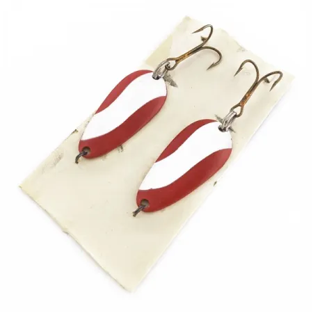 Röda och vita emaljrander skapar en kontrastrik finish på framsidan av dessa Glen Evans Spoon skeddrag. Varje drag mäter 1 1/2" (3,8 cm) i längd och väger 3/16 oz (6 g). Insidan av den stansade metallkroppen exponerar en ren kopparyta, vilket ger ett metalliskt blänk mot den målade sidan. Under produktkod 24601 innehåller detta set två matchande drag som är oanvända. En enkel trekrok är monterad på stjärten av den droppformade profilen. Små märken från tillverkningsprocessen är synliga där metallen formades.
