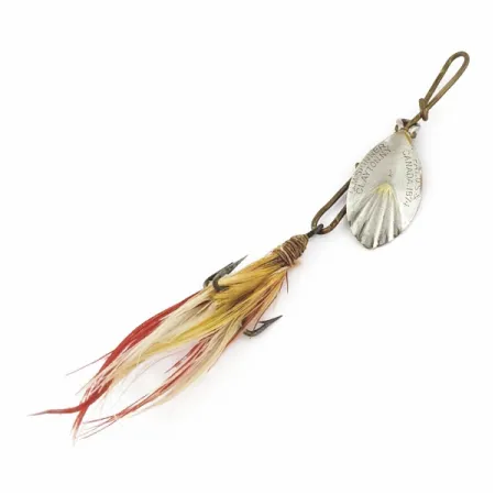 Det nickelpläterade skeden på denna spinnare i storlek 1 är stämplat med ett kanadensiskt patentdatum från 1874 och har den klassiska räfflade snäckdesignen. Skedens framsida visar G.M. Skinner-tillverkarens märke från Clayton, New York, vilket framhäver skärpan i den ursprungliga präglingen. En totallängd på 7 cm (2 3/4") kombineras med en vikt på 3,5 g (1/8 oz) för detta exemplar, identifierat med produktkod 24500. Röda, gula och vita fjädrar är säkert bundna till trekroken, vilket skapar en livlig profil. Med ett skickbetyg på 5/5 behåller nickelpläteringen en blank finish över de räfflade ytorna.