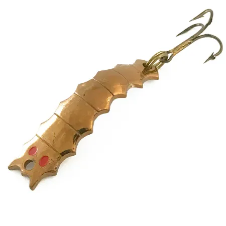 Segmenterade kopparfjäll definierar kroppen på detta unika skeddrag i larvstil, tillverkat i USA. Al's Goldfish Helgy, produktkod 6650, har en böjd profil designad för att efterlikna vattenlevande insekter. Med en längd på 4,5 cm (1 3/4") uppvisar metallkroppen djupa koppartoner accentuerade av två tydliga röda prickar nära linfästet. Med en vikt på 5,5 g (3/16 oz) är detta exemplar ett utmärkt exempel på amerikansk tillverkning av fiskeredskap, främst utformat för kast i strömmar eller mindre vattendrag. Maskinvaran är i toppskick, med en robust fjäderring som ansluter en klassisk trekrok med bronsfinish. Detta drag är i 5/5 skick och visar en ljus, jämn finish över sin räfflade yta.