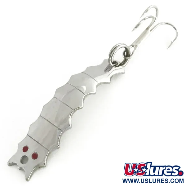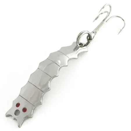 Förnicklingen ger en briljant reflekterande yta på detta 3/16 oz (4,5 g) Goldfish Helgy, ett klassiskt amerikanskt skeddrag med en segmenterad, insektsliknande profil. Med en längd på 1 3/4" (4,5 cm) har kroppen en serie räfflor som fångar ljuset från flera vinklar, vilket leder ner till den skarpa "GOLDFISH HELGY"-stämplingen på baksidan. Betets huvud är försett med två små, klarröda ögon och ett rent linhål, medan stjärtänden är utrustad med en kraftig fjäderring och en matchande trekrok i nickel. Med produktkod 8621 är detta bete i 5/5-skick och behåller en jämn och felfri finish över hela ytan. Dess design efterliknar utseendet hos en helgrammite, ett viktigt födoämne för många sötvattensarter.