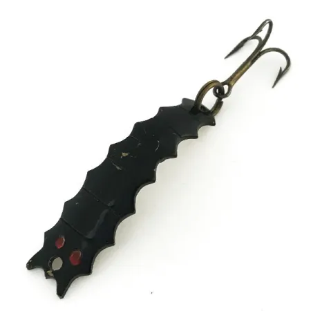 Röda ögon framträder tydligt mot den djupsvarta kroppen på detta 3/16oz (4,5g) exemplar från Al's Goldfish. Helgy, med produktkod 8622, är ett särpräglat USA-tillverkat bete som fångar den segmenterade silhuetten av en Hellgrammite-larv. Med en längd på 1 3/4" (4,5cm) är det ett kompakt verktyg med en robust trekrok ansluten via en fjäderring i mässingston. Finishen är anmärkningsvärt intakt och får betyget 5/5 för sina rena ytor och välbevarade målade detaljer. En subtil guldunderton syns där ljuset träffar metallkroppens räfflor, vilket återspeglar den hantverksskicklighet som förväntas av detta klassiska märke. Hårdvaran uppvisar en mjuk åldrad ton men förblir strukturellt sund för visning eller försiktigt strömfiske.