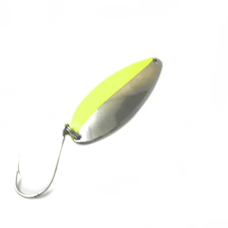 En förnicklad yta parad med en livfull grön rand definierar estetiken hos detta klassiska amerikanska skeddrag. Med måtten 5,5 cm (2 1/4") och en vikt på 11 g (2/5 oz) är denna modell från Great Lakes Lures (produktkod 0435) ett typexempel på amerikanskt hantverk. Konstruktionen består av en stansad metallkropp med en polerad nickelsida på undersidan, medan ovansidan är uppdelad mellan den rena metallen och en lysande grönmålad sektion. Detta exemplar uppvisar en välbevarad finish, vilket ger ett skickbetyg på 4/5, med endast lätta ytmärken synliga på de reflekterande ytorna. Enkelkroken är säkert fäst via en kraftig fjäderring vid bakre delen, avsedd för spinnfiske eller trolling i öppet vatten. Denna tvåfärgade finish ger en tydlig visuell kontrast mellan nickelns höga lyster och den gröna accentens synlighet.