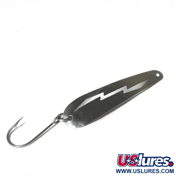 Denna USA-tillverkade Great Lakes Lures trollingsked är 8 cm (3 1/4") lång och ingår i märkets specialiserade Great Lakes-serie. En vikt på 5 g (3/16 oz) gör den till ett smidigt val för olika trollingshastigheter. Ena sidan har ett skarpt blixtmotiv, medan baksidan visar en diagonal röd glitterrand och ett tydligt chartreuse-öga. Detta exemplar har produktkod 0479 och är i mycket gott skick med betyget 4/5, och uppvisar en blank nickelfinish över hela kroppen. Betet är utrustat med en enkelkrok monterad på en kraftig fjäderring, en uppsättning som föredras för sin styrka och pålitlighet vid hugg.
