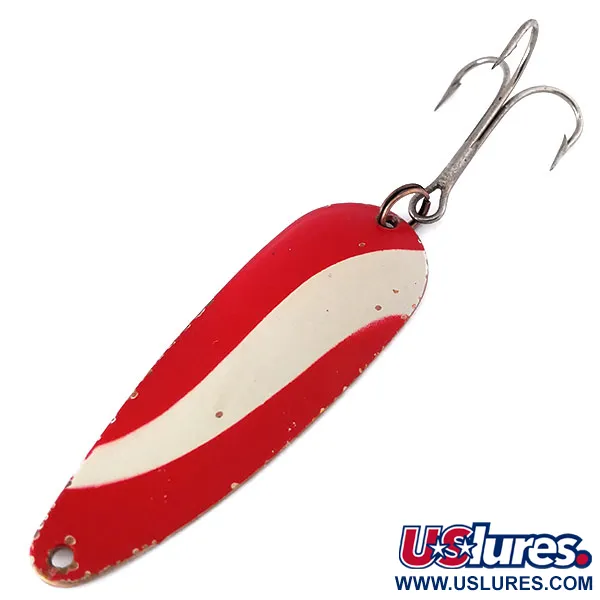 Kopparbaksidan på detta exemplar har en tydlig "Gypsy King 0"-stämpel, som identifierar den som en klassisk Weller-skapelse från USA. Med en längd på 6 cm (2 1/4") och en vikt på 11 g (2/5 oz) uppvisar betets metallkropp ett traditionellt röd- och vitrandigt diagonalt mönster på den konvexa sidan. Detta färgval var en stapelvara för sportfiskare under mitten av seklet som sökte hög synlighet. Baksidan visar den ursprungliga kopparfinishen, som uppvisar mindre ålderstecken i linje med dess skickbetyg på 4/5. En enkel trekrok är fäst i bakänden med en fjäderring, medan nosen har ett rent fästhål. Skeddragets konstruktion, som identifieras med produktkod 10511, framhäver det hållbara metallarbete som är typiskt för äldre amerikanska fiskeredskap.