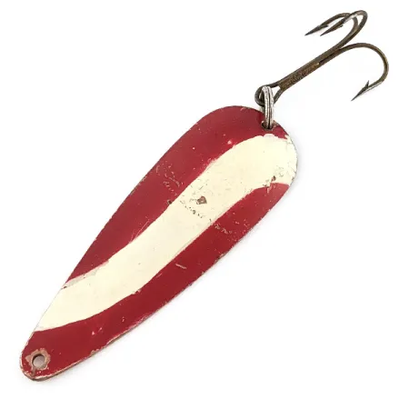 Kopparpläteringen på baksidan fungerar som bakgrund för "Gypsy King 1"-stämplingen, vilket intygar att detta är ett genuint Weller-drag tillverkat i USA. Draget mäter 7 cm (2 3/4") och väger 17 g (3/5 oz) och har det ikoniska röd-vita diagonala randmönstret över metallkroppen. Detta exemplar, med produktkod 22831, är i skick 4/5 med lätt och naturligt slitage. Små färgsläpp syns nära linöglan och längs ytterkanterna, där kopparbasen lyser igenom. Komponenterna består av en hållbar bronserad trekrok monterad med en fjäderring i stål, framtagen för spinnfiske. På baksidan ger varumärkets typsnitt i handskriftsstil och storleksstämpeln "1" en tydlig koppling till mitten av 1900-talets betestillverkning.