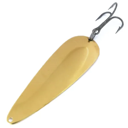 Med en vikt på 3/4 oz (21 g) fångar detta skeddrag i massiv mässing den klassiska amerikanska betesdesignen från mitten av seklet. Denna Gypsy King 2, tillverkad av Weller, mäter 3 1/4" (8,5 cm) i längd och har en djup, tydlig stämpel av sitt namn på den konkava sidan. Detta specifika exemplar, katalogiserat under produktkod 10699, är i utmärkt skick 5/5 och visar inga tecken på användning. Kroppen i kraftig mässing är parad med en robust trekrok, vilket återspeglar den tidens stabila tillverkningsstandard. En enkel ögla i huvudet möjliggör enkel tackling för kast eller trolling. Mässingsytan har bevarats väl och bibehåller en ljus, reflekterande yta över den droppformade profilen.