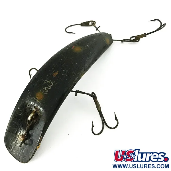 Med en längd på exakt 9 cm (3 1/2") visar den böjda träprofilen på denna Helin FlatFish prov på det klassiska hantverket från den tidiga produktionen i Detroit. En svart baslack dekorerad med utspridda orange-gula prickar ger hög kontrast, ett mönster som länge varit en favorit för olika sötvattensförhållanden. Denna modell på 10 g (1/3 oz), med produktkod 7127, har det traditionella Helin spreader-bar-systemet designat för att maximera krokningen samtidigt som dragets avsedda balans bibehålls vid långsam trolling. Ytfinishen är graderad 4/5 och uppvisar fina linjer och spår av historik över träytan som speglar dess resa genom fiskelådorna. Varje skruvögla och krok är intakt, vilket framhäver den robusta byggkvalitet som Helin Tackle var känd för före övergången till plastmaterial. Sportfiskare använde ursprungligen dessa för öring och gädda, och förlitade sig på prestandan i låga hastigheter som dikteras av den unika designen med platt framsida.