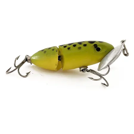 Ett klassiskt grodmönster med tydliga svarta prickar på en gul bas täcker den 5,5 cm (2 1/4") ledade kroppen på denna vintage crawler. Med en vikt på 7 g (1/4 oz) tillverkades detta exemplar för Herter's (produktkod 11842) under efterkrigstiden i det ockuperade Japan. Konstruktionen har en tvådelad kropp i trä eller plast som sammanfogas av ett robust metallgångjärn, parat med en stor, polerad sked i metall utformad för ytfiske. Båda trekrokarna sitter säkert fast i traditionella öglor, vilket återspeglar ett välskött skick på 5/5. Lacken är särskilt välbevarad över båda segmenten, vilket visar på tillverkningskvaliteten hos japanska importer från denna specifika historiska period. Samlare letar ofta efter just detta Herter's-bete tack vare den karakteristiska breda skeden som kännetecknar ytbete från mitten av seklet.