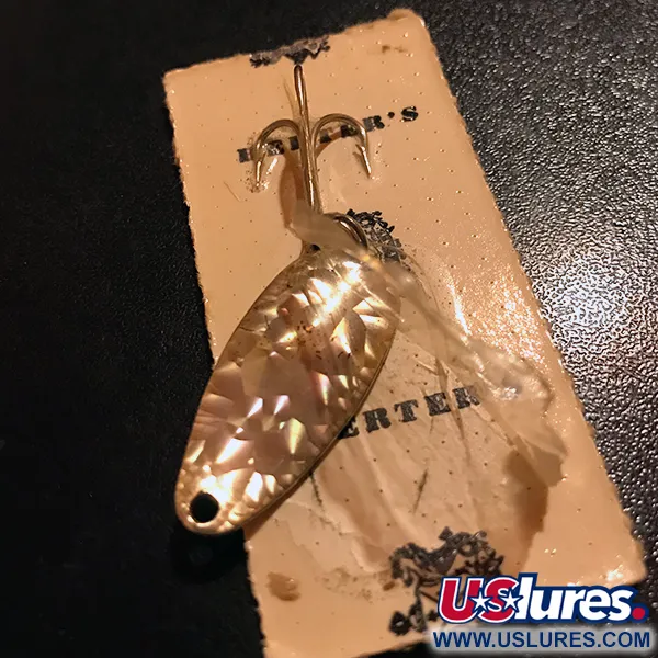 Hamrad guldplätering fångar ljuset på den 3,5 cm (1 1/2") långa kroppen på detta vintage skeddrag. Med en vikt på 6 g (3/16 oz) bär Herter's Crystal tydliga spår av efterkrigstiden, då det tillverkades i det ockuperade Japan. Detta exemplar, identifierat med produktkod 12175, har en djupt mönstrad yta designad för att maximera blänket vid jämn invevning. Draget sitter kvar på sin ursprungliga, om än väderbitna, ljusbruna pappbaksida och är oanvänt. Medan den skyddande plastremsan har vittrat sönder med tiden, är metallfinishen och den vassa trekroken anmärkningsvärt välbevarade. Längst ner på displaykortet finns Herter’s klassiska vapensköld, ett kännetecken för samlare av amerikanska fiskeredskap från mitten av seklet.