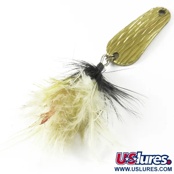Med en vikt på 1/4 oz (8 g) speglar de klassiska proportionerna hos detta skeddrag den praktiska designfilosofi som gjorde George Leonard Herters katalog till en stapelvara för sportfiskare under mitten av seklet. Guldpläteringen har en vågig, hamrad textur på den konvexa sidan, medan insidan är polerad slät och bär den tydliga stämpeln "HERTER'S HUDSON BAY SPOON". Draget mäter 1 1/2" (4 cm) och är utrustat med en fjäderklädd trekrok, där vita och svarta fibrer förlänger betets profil. Detta specifika exemplar, med produktkod 3493, tillverkades i Japan under en era då Herter’s köpte in robusta komponenter från utlandet för att möta amerikanska sportfiskares krav. Metallen visar mindre åldersrelaterat slitage, vilket ger den ett stabilt skickbetyg på 4/5, men den förblir en ren och funktionell historisk raritet. Att kasta detta lätta skeddrag var en standardteknik för öring och abborrfiskar, där man förlitade sig på guldytans lyster och den subtila naturtrogna känslan hos den klädda kroken.