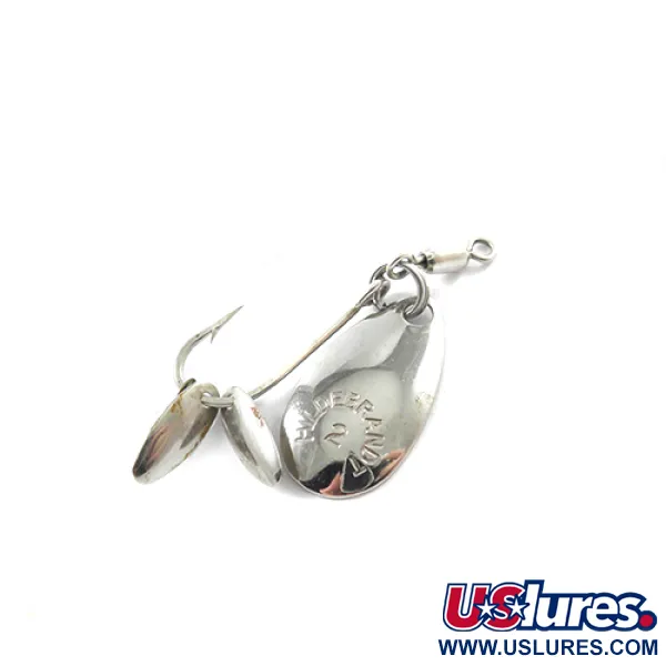 Förnickling ger en ren, reflekterande finish på ramen på 2,5 cm (1") på denna klassiska spinnare. Stämplad med « HILDEBRANDT 2 » på huvudskeden, är denna Yakima Bait-skapelse igenkännlig för alla ultra-light-entusiaster. Detta exemplar, produktkod 1819, väger 1,4 g (3/64 oz) och har enkelkrok. De två unika små soniska skedarna monterade direkt på krokskaftet ger en extra mekanisk dimension. En lekare i toppen motverkar linvridning. Skick 4/5, nickelytorna är blanka och stämplingen är tydlig, med endast minimala tecken på ålder på metallkomponenterna.