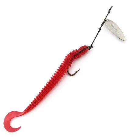 Ett klassiskt nickelpläterat willow-sked, tydligt stämplat med Hildebrandt-namnet, utgör den primära attraktionen på denna 20404-rigg. Med en vikt på 4,5 g kombinerar konstruktionen en traditionell spinnararm med en transparent röd mjukbeteskropp. Denna 15 cm räfflade jigg är monterad på en enkelkrok, vilket ger en tydlig profil för kast i skiftande miljöer. Hårdvaran är tillverkad i USA av Hildebrandt Spinners och uppvisar precision i trådlindningen samt en högkvalitativ finish på skeden. Exemplaret är i skick 5/5; nickelpläteringen reflekterar ljuset rent och den röda plasten har bibehållit sin ursprungliga mjukhet. Kroken är vass och sitter stadigt i jiggkroppens räfflade segment.