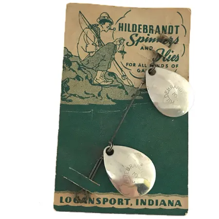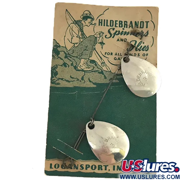 Förnicklade droppformade skedar, präglade med det ikoniska märket «HILDEBRANDT 3», framhäver det funktionella hantverket i detta vintage-tackle. Med en vikt på 3/32oz (3g) förblir denna dubbla spinnarkonfiguration monterad på sitt ursprungliga illustrerade butikskort, som anger ursprunget till Logansport, Indiana. Baksidan av förpackningen identifierar detta som en «äkta No. C1» HILDEBRANDT SPINNER (No. C Idaho Spinner), specifikt utformad för att fiskas tillsammans med traditionella flugor för alla sportfiskar. Katalogiserad under produktkod 8519, har exemplaret två blanka skedar på en ren trådaxel. Finishen på metallkomponenterna har bevarats exceptionellt väl och reflekterar ljuset precis som den gjorde för decennier sedan i USA. Detta exemplar visar det tidiga 1900-talets inställning till beten med flera skedar, med enkla mekaniska anslutningar som gör att skedarna kan rotera fritt runt mittaxeln. Exemplaret är i 5/5 skick och behåller sin ursprungliga glans och strukturella integritet, medan kortet fungerar som ett historiskt arkiv över varumärkets rötter i Mellanvästern.
