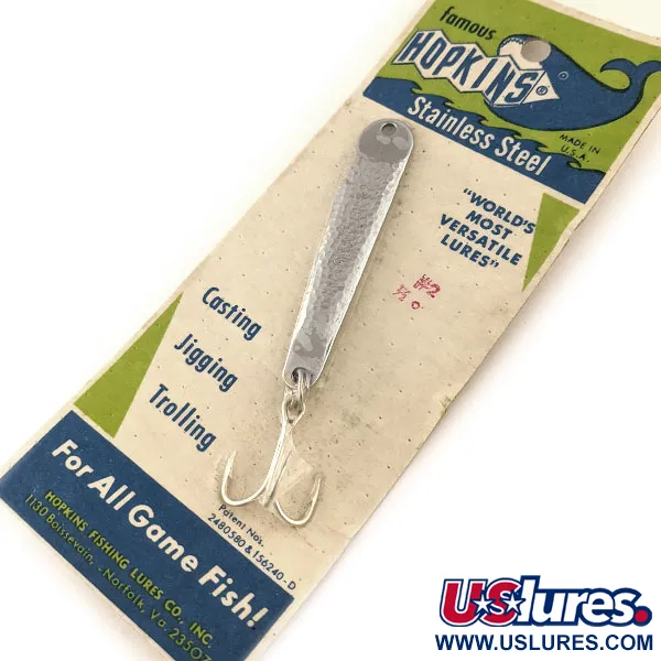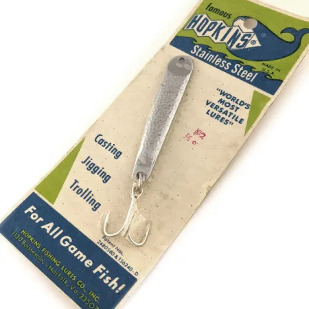 En distinkt hamrad nickelyta definierar detta klassiska Hopkins No=Eql-drag, vars texturerade yta av rostfritt stål fångar ljuset effektivt. Med en längd på 6,5 cm (2 1/2") och en vikt på 14 g (1/2 oz) är modell 11401 konstruerad av solitt rostfritt stål för att förhindra flagning eller avskalning över tid. Detta specifika exemplar är oanvänt och sitter fortfarande kvar på sitt ursprungliga 'famous HOPKINS' displaykort, som är i skick 6. Tillverkat av Hopkins Fishing Lures Co., Inc. i Norfolk, Virginia, har draget en förtent trekrok och är märkt med patentnr 2480380 och 156240-D. Förpackningen beskriver dess mångsidighet för spinnfiske, jigging och trolling efter alla typer av rovfiskar i både söt- och saltvatten. Kortets baksida ger tekniska insikter för effektiv användning och rekommenderar varierande invevningshastigheter och specifika djup för jigging nära strukturer som broar eller pirer.