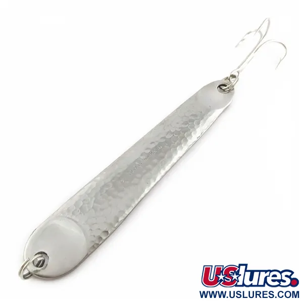 Den hamrade nickelfinishen ger denna pilk på 70 g (2 1/2 oz) en unik visuell profil, en design sprungen ur R.L. Hopkins strävan 1949 efter ett mer slitstarkt saltvattensdrag. Med en längd på 11,5 cm (4 1/2") är Hopkins No=Eql 4 (produktkod 24291) smidd för att ge den densitet som krävs för att nå djupt liggande strukturer eller skära genom hård vind vid kast. Det exemplar som presenteras här är i skick 5/5 och har kvar sin klara lyster och strukturella integritet. En kraftig trekrok är monterad baktill, vilket speglar tillverkarens fokus på komponenter som tål pressen från en troféfisk. Den används främst för vertikalfiske eller långdistanskastning efter arter som gös eller havsabborre, och dess konstruktion förblir en standard för sportfiskare som söker hållbarhet och vikt.