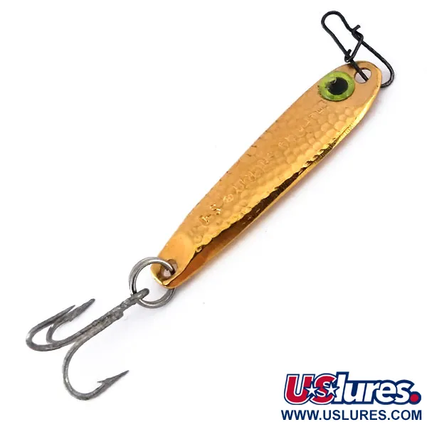 Den hamrade guldytan på detta smidda skeddrag glittrar i ljuset och ger en tydlig texturkontrast som har definierat Hopkins-beten i decennier. Med en vikt på 1/3oz (9g) och ett mått på 1 3/4" (4,5cm) är Shorty S1 en klassisk design med "S1" stämplat direkt i metallkroppen. Detta specifika exemplar, identifierat med produktkod 10042, är i 5/5 skick och uppvisar en blank, reflekterande yta och vass hårdvara. Ögat, en liten grönkantad detalj nära linögat, ger en subtil fokuspunkt på betets huvud. Stolt tillverkad i USA; konstruktionen i massivt rostfritt stål garanterar hållbarhet medan det monterade beteslåset möjliggör snabbt byte. Dess enkla men effektiva droppformade profil är parad med en kraftig trekrok som säkrats med en extra stark fjäderring.
