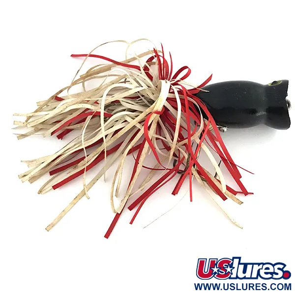 Svart pigment täcker den kompakta kroppen på detta exemplar på 4 cm (1 1/2"). Denna Fred Arbogast Hula Popper, listad under produktkod 8650, väger 8 g (1/4 oz) och representerar en hörnsten i ytbetets historia. Dess signum, Hula-kjolen i gummi, presenteras här i en slående kombination av röda och gräddvita trådar som kontrasterar mot det mörka skrovet. Denna kjoldesign, som Arbogast var först med på 1940-talet, var tänkt att ge visuell rörelse även under spinnstopp. Den djupt skålade munnen är konstruerad för en specifik yt-popping-teknik, medan de stora målade ögonen ger en tydlig blickpunkt. Om vi tittar på detaljerna ser vi traditionella krokhållare och en ren finish som ger detta bete ett skickbetyg på 5/5. Den lilla profilen gör det särskilt lämpligt för fiske efter abborre i mindre bäckar där insekter eller små grodor är naturliga byten.