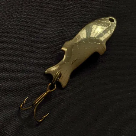Detaljerat fjällmönster som reflekterar ljuset över den polerade ytan pryder detta guldskeddrag, ett klassiskt metallhantverk från amerikanska Ideal Products. Med en vikt på 4 g (1/8 oz) och en längd på 4,5 cm (1 3/4"), efterliknar den anatomiska profilen en liten betesfisk, vilket gör det till ett specifikt designval för spinnfiske med lätt utrustning. Metallkroppen har en djupt konkav baksida som förstärker den reflekterande guldfinishen och ger god synlighet även i grumligt vatten. En vass trekrok är fäst i bakändan med en fjäderring. Detta specifika drag, med produktkod 22987, är i ett vackert 5/5-skick med en blank och ren yta. Ett fästhål är placerat i den avsmalnande nosen för effektiv montering.