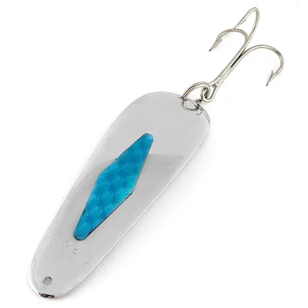 Med en längd på 9 cm uppvisar detta USA-tillverkade skeddrag den karakteristiska profil som Miller är känd för. Den nickelfinishade kroppen på ITHACA 75 trollingsked har ett livfullt blått diamantmönstrat inlägg som kontrasterar skarpt mot den polerade metallen. Betet väger 10 g och är utformat med en bred, rundad bakdel och en smalare nos, en konstruktion anpassad för traditionell trolling. På baksidan är den rena, reflekterande ytan välbevarad och visar den stansade metallens jämna välvning. Hårdvaran inkluderar en robust silverfärgad trekrok fäst med en kraftig fjäderring, båda i utmärkt skick. För ett exemplar med produktkod 22642 är skicket anmärkningsvärda 5/5, där ursprungsglansen bibehållits utan betydande skavanker. Denna specifika Ithaca 75-modell förblir ett betydande fynd för dem som dokumenterar regionala amerikanska betestillverkare från Ithaca, New York-området.
