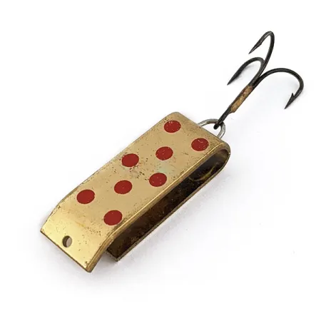 Röda prickar pryder en klassisk guldfärgad yta på detta vintage 3,5 cm (1 1/2") metallbete. Exemplaret, identifierat med produktkod 18180, har en unik konstruktion med vinklad plåt som kombinerar egenskaperna hos ett skeddrag och en spinnare. Med en vikt på 9 g (1/3 oz) är Lil Jake balanserad för precisa kast i både strömmande vatten och sjöar. Detta USA-tillverkade bete från Wyoming uppvisar spår av varsam hantering, vilket ger det ett skickbetyg på 4 av 5. Guldpläteringen har kvar sin klara lyster över den rektangulära kroppen, som övergår i en skarp bockning nära linfästet. En mörk trekrok är säkert monterad med en kraftig fjäderring i bakänden, vilket speglar den funktionella design som är typisk för tidig produktion från Jake's Lures.