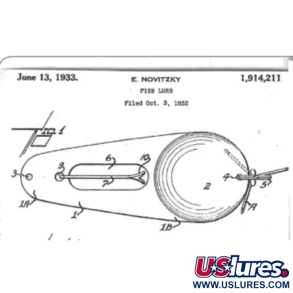Tillverkarmärkningen James Aitken, Toledo, Ohio, som är tydligt instämplad i den konvexa ytan, bekräftar härkomsten för detta 8 cm långa förnicklade skeddrag. Just denna Muskielure-modell, produktkod 11652, är en direkt länk till Percy Havers design från 1932-1933, ett namn som är synonymt med legendariska musky-fångster i Lake St. Clair. Designen utmärker sig genom den lilla fiskformade metallsiluetten som är fäst i huvudkroppens utskurna del, vilket ger en unik visuell profil för spinnfiske eller trolling. Med en vikt på 21 g är draget utrustat med en robust trekrok, byggd för att tåla trycket från tunga sötvattenspredatorer. Nickelfinishen är fortfarande blank över större delen av ytan, vilket ger betyget 4/5 i skick för dess ärliga slitage och välbevarade metallarbete. Monteringen är original, inklusive den stora fästringen i nosen och den kraftiga fjäderringen som fäster kroken i stjärten.