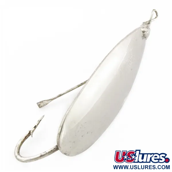 Detta klassiska skeddrag mäter 6 cm (2 1/4") och har det karaktäristiska vasskyddet designat för fiske i tät vegetation. En robust krok är fastlödd direkt på den förnicklade kroppen, vilket säkerställer att spetsen förblir upprätt under invevningen för att minimera risken för bottennapp. Med en vikt på 12 g (2/5 oz) är metallen tjockare längs mittlinjen för att ge stabilitet och en distinkt gång utan linvridning. Detta specifika exemplar är stämplat med "Made in USA", vilket skiljer det från modern produktion utomlands. Skeddragets droppformade profil tillåter långa kast in i vassbälten eller bland näckrosor där rovfisken gömmer sig. Det var ursprungligen konstruerat för att fiskas ensamt eller tillsammans med en pork rind-trailer för extra volym och rörelse. Skicket är klassat som 5/5, med den blanka finishen och hårdvaran intakt som förväntat av ett välbevarat vintage-bete. Produktkod: 24556.