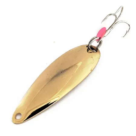 Tydligt präglat på baksidan av den polerade guldkroppen finns 'JOHNSON'S SPRITE'-märkningen, vilket markerar detta som ett klassiskt stycke amerikansk sportfiskehistoria. Finishen på denna 11516-modell är anmärkningsvärt ren med ett skickbetyg på 5/5. Med en vikt på 10 g (1/3 oz) och en längd på 5,5 cm (2 1/4"), härstammar detta skeddrag från eran när Johnson-beten fortfarande tillverkades i USA. En märkbar detalj på detta exemplar är den lilla rosa attraktorfenan i plast som är fäst vid fjäderringen, utformad för att ge en färgklick nära trekroken. Konstruktionen inkluderar en robust silverfärgad fjäderring i fören för lininfästning och en andra i aktern för att säkra krokaggregatet. Detta droppformade bete är byggt för spinnfiske och trolling och behåller sin lyster och strukturella styrka i alla delar.