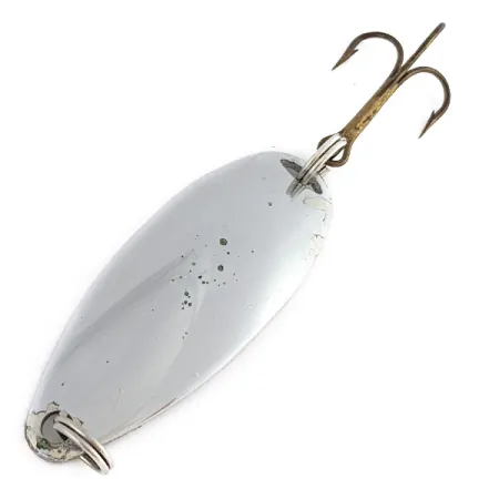 Med en vikt på 10 g bär detta skeddrags stansade metallkropp på arvet från amerikansk betestillverkning. På baksidan syns tydligt gravyren 'JOHNSON'S SPRITE', ett kännetecken för hantverket från Louis Johnson Company. Med en längd på 5 cm är nickelfinishen fortfarande blank, även om den uppvisar ett visst naturligt ytslitage och mindre fläckar som är karaktäristiska för dess skickbetyg på 4/5. Denna vintageartikel, listad under artikelnummer 22550, är utrustad med fjäderringar av originaltyp och en robust bronserad trekrok. Den droppformade profilen är något tjockare i botten, vilket koncentrerar vikten för att ge bra kastlängder.